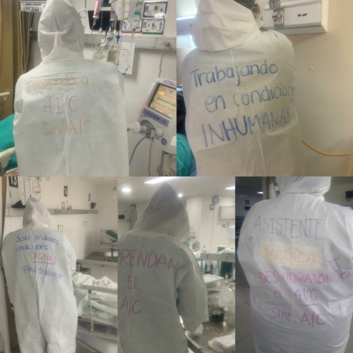 Con mensajes de protesta en sus trajes blancos especiales de protección contra el Coronavirus, más de 25 médicos, personal de enfermería y profesionistas de la salud se manifestaron durante su jornada laboral, al afirmar que llevaban 2 semanas con problemas en el aire acondicionado generando que trabajaran con temperaturas superiores a los 35 grados centígrados.