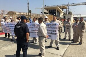 PLAYAS DE ROSARITO, BAJA CALIFORNIA,24 febrero 2021/Un grupo de trabajadores de la planta almacenadora de Pemex en Rosarito, bloquearon la puerta de salida de la empresa, con pipas distribuidoras, en protesta por la falta de medicamentos para los derechohabientes.