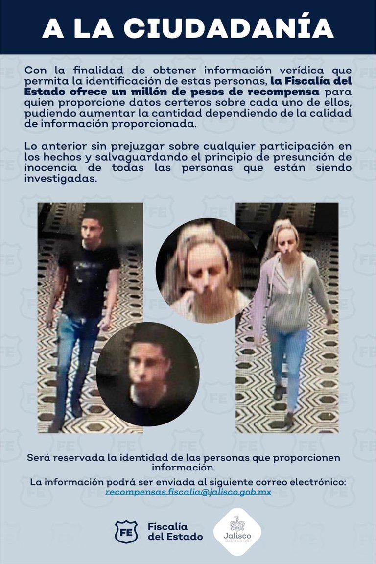 Este miércoles, la Fiscalía de Jalisco ha hecho pública la recompensa de un millón de pesos por información verídica que conduzca a la identificación de dos personas, un hombre y una mujer, que presuntamente habrían participado en el asesinato del ex gobernador de la entidad, Aristóteles Sandoval, el pasado 18 de diciembre en el restaurante bar Distrito 5.