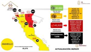 La Secretaría de Salud (SS) en Baja California, informó que al martes 9 de marzo 2021, hay 398 pacientes nuevos con el COVID 19 activos en todo el estado. 186 son de Tijuana, 95 de Mexicali, 50 están en Ensenada, 34 en San Quintín, 20 en Playas de Rosarito, 12 en Tecate y uno en San Felipe.Ya se cuentan 7 mil 508 personas que han fallecido por el virus.