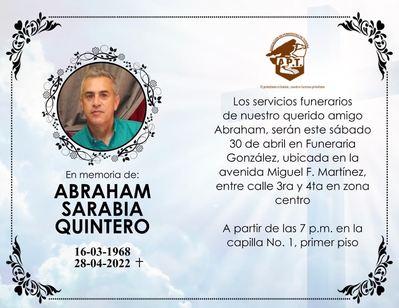 VELARÁN A ABRAHAM SARAVIA EL SÁBADO DESDE LAS 19 HORAS EN FUNERARIA GONZÁLEZ