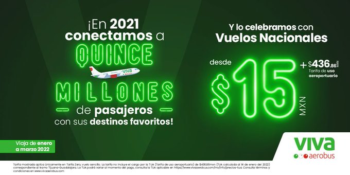 La promoción aplica de enero a marzo de 2022 en vuelos del tramo de la ruta Tijuana-Guadalajara. Se debe considerar la TUA, que en Tijuana es de 436.86 pesos, en Guadalajara de 444.86 pesos y en La Paz de 504.6.