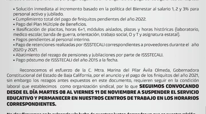 Representantes del magisterio informaron en un comunicado que la suspensión se extenderá hasta el viernes 11 de noviembre del presente para exigir el pago de los salarios y prestaciones laborales, así como pagos de retenciones de parte del Issstecali. De acuerdo a sus estadísticas, este sindicato está conformado por 15 mil 500 trabajadores, quienes atienden a 230 mil estudiantes.