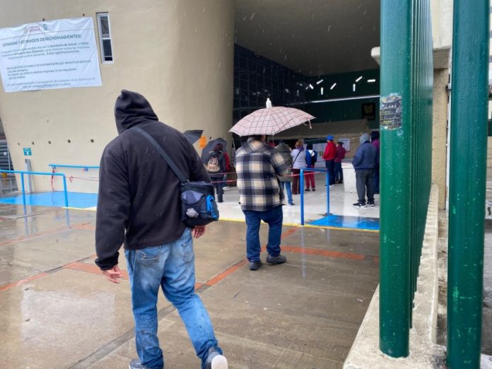 Durante el aguacero del viernes, una pequeña multitud de pacientes se acurrucó bajo un toldo en las afueras de la Clínica 20 del IMSS, otro hospital general de Tijuana. Muchos de ellos estaban tosiendo y usando máscaras mientras esperaban más de 30 minutos para que los dejaran entrar para recibir atención médica.
